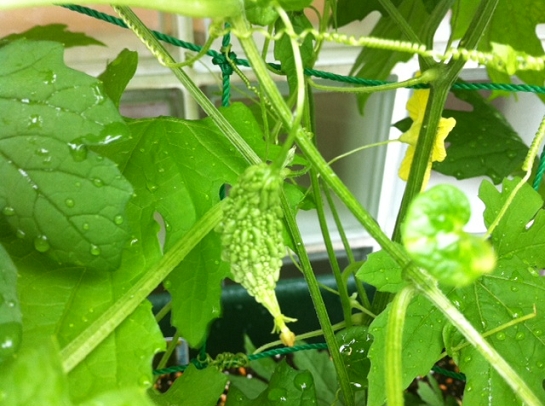 「ゴーヤの緑のカーテン」。 それは直射日光を遮ることにより屋内の温度を下げる効果だけではなく、植物の葉から水分が蒸発する際に周囲の熱を奪う「蒸散作用」も利用して、温度を下げることをめざしています。病害虫に強く栽培は容易。ということで待合室の窓にゴーヤのグリーンカーテンを栽培することにしました。株の生育速度は凄まじく、朝の日差しを防いでくれる高さまであっという間に成長し、雌花のもとに既にミニゴーヤが。ウリ科植物の例にもれず、品種がたくさんあるのですね。あばしゴーヤ、中長ゴーヤ、白ゴーヤ、太レイシの4種類を2株ずつプランターに植えましたが、種を取ると交雑しているでしょうね。